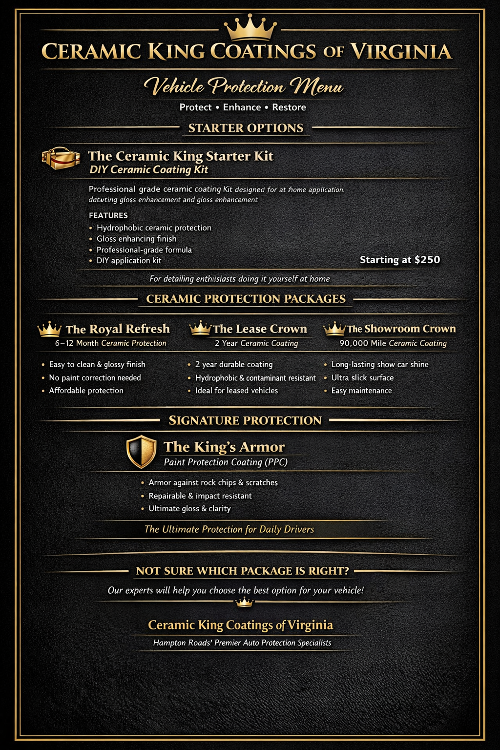 At Ceramic King Coatings, we specialize in high-performance ceramic coating packages in Virginia Beach designed to protect your vehicle from harsh coastal elements while delivering a deep, mirror-like finish.